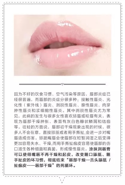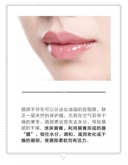 换季是敏感期,身体的肌肤有暖暖的衣物保护,但是裸露在空气中的脸蛋可没有那么幸运。其中,嘴部皮肤的厚度只有身体其它部位的1/3,且因为缺乏皮脂腺、汗腺的缘故,唇部没有皮脂膜的天然保护,自身又缺乏滋润能力,导致唇部最易受环境影响而损伤。