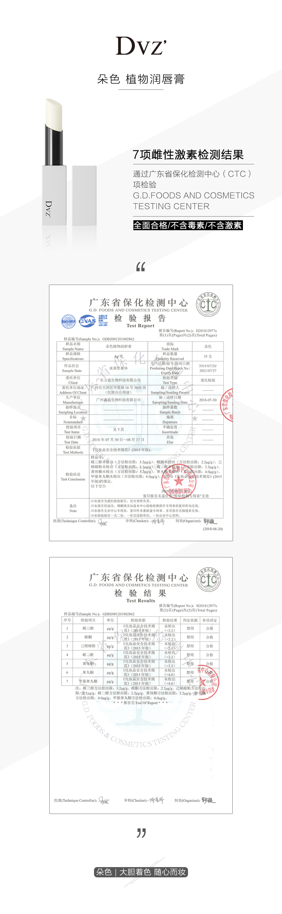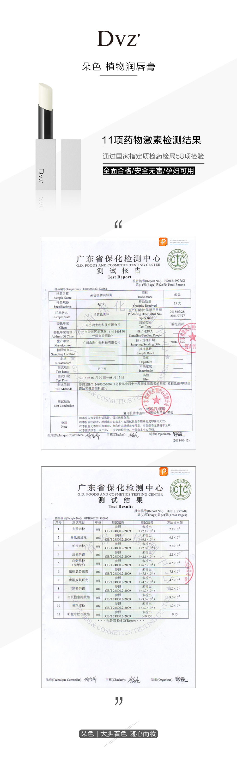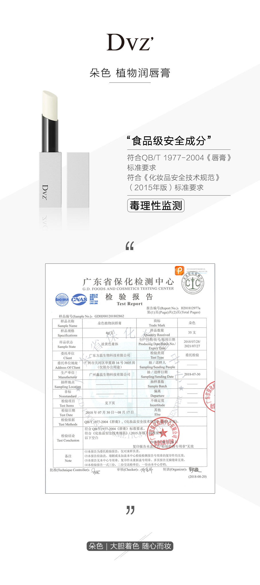 DVZ’植物润唇膏是温和食品级护唇好物,已经通过国家指定质检药检局全面检测,真正做到了不含重金属、不添加香精、不含激素、不含荧光剂、不含毒素,孕妇可以放心使用。