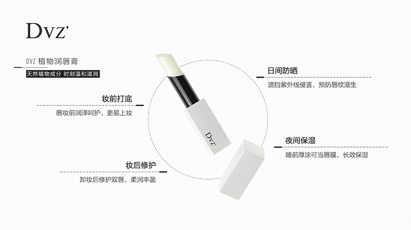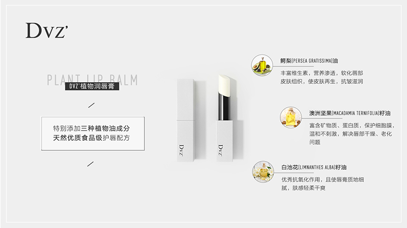 DVZ’植物润唇膏,贴心地添加了日本进口的植物甾醇,可促进新陈代谢,抑制皮肤炎症,防日晒红斑。