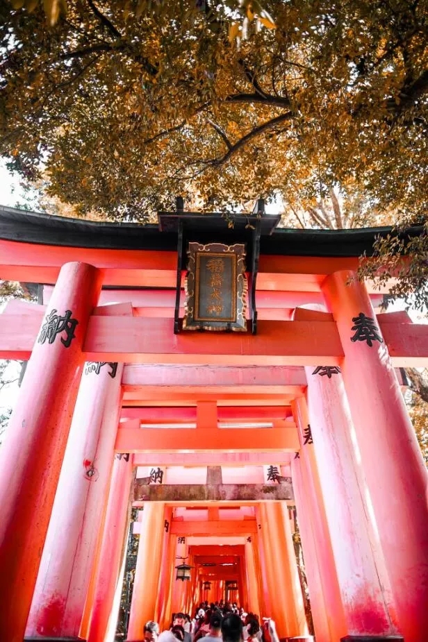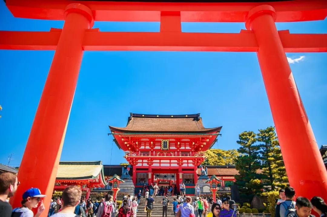 日本伏见稻荷大社建于 8 世纪,稻荷神是农业与商业的神明,香客前来祭拜求取农作丰收、生意兴隆、交通安全。它是京都地区香火最盛的神社之一。蓝天为背景,红色主体的神社,在秋日阳光下,显露出超凡脱俗的和谐格调,让人的心情也莫名的舒畅起来。