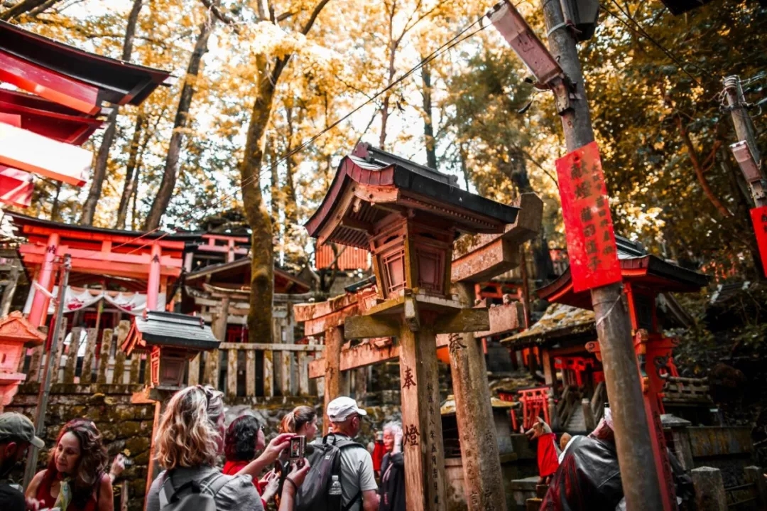 最出名的要数神社主殿后面密集的朱红色"千本鸟居",是京都最具代表性的景观之一,成百上千座的朱红色鸟居构成了一条通往稻荷山山顶的通道。老朽褪色的暗红色牌坊和光鲜亮丽的朱红色牌坊密集地交织在一起,透过阳光的照射显得格外壮观迷人,视觉上颇为震撼。